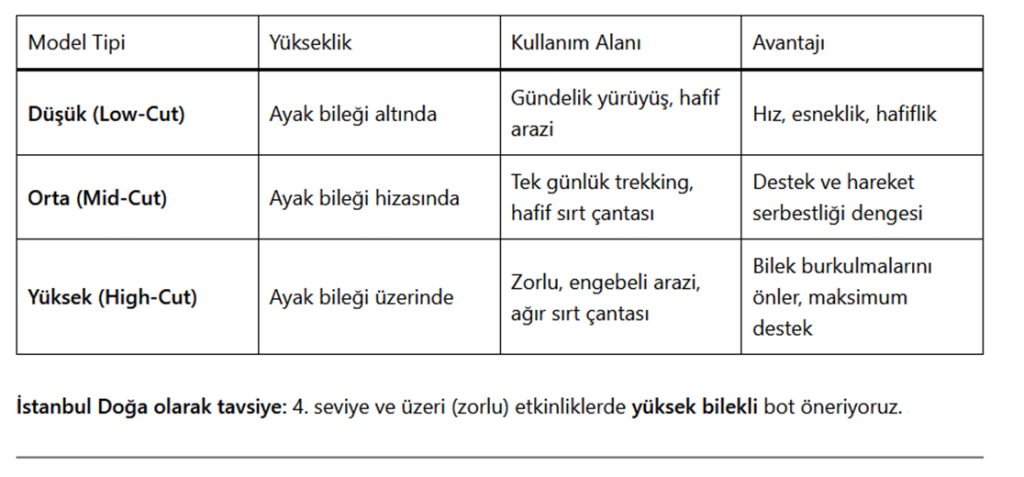 Doğada geçirilen saatler, doğru ekipmanlarla konforlu ve güvenli hale gelir. Bu ekipmanların en önemlisi, kuşkusuz trekking botudur. Zira doğa yürüyüşlerinde en fazla yük ayaklarınıza biner. Bu nedenle uygun bir bot seçimi, hem performansınızı artırır hem de sakatlanmaları önler; iyi bir bot yatırımdır.